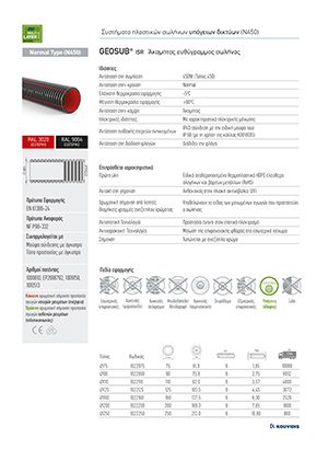 GEOSUB N450 rigid conduit in bars belongs to the same product family as GEONFLEX rigid conduit in bars and is one of the most important investments of KOUVIDIS in the field of cable management and protection in buried underground networks. It was launched in 2014 in order to be used in buried underground networks with lower mechanical requirements. In 2017, the company launched the 2<sup>nd</sup> generation of GEOSUB N450 with color marking, which specifies the color coding according to the application field (electrical installations or communication systems), upgrading both product itself and electrician’s work.