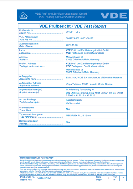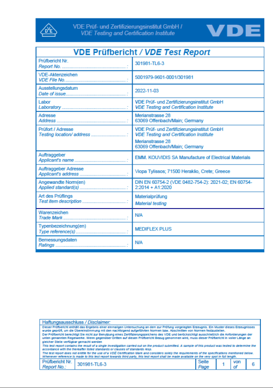 MEDIFLEX PLUS – VDE Test Report (low smoke test)